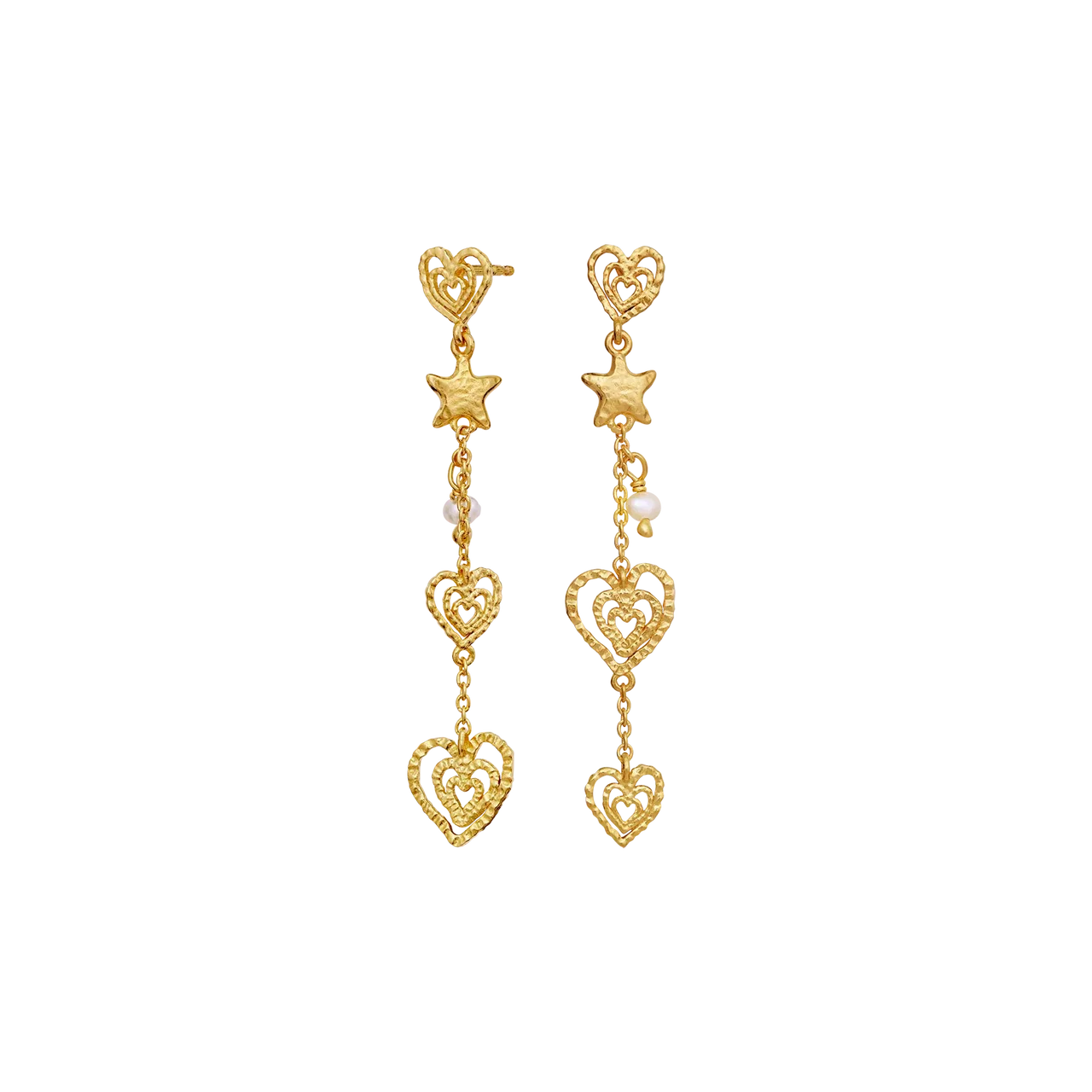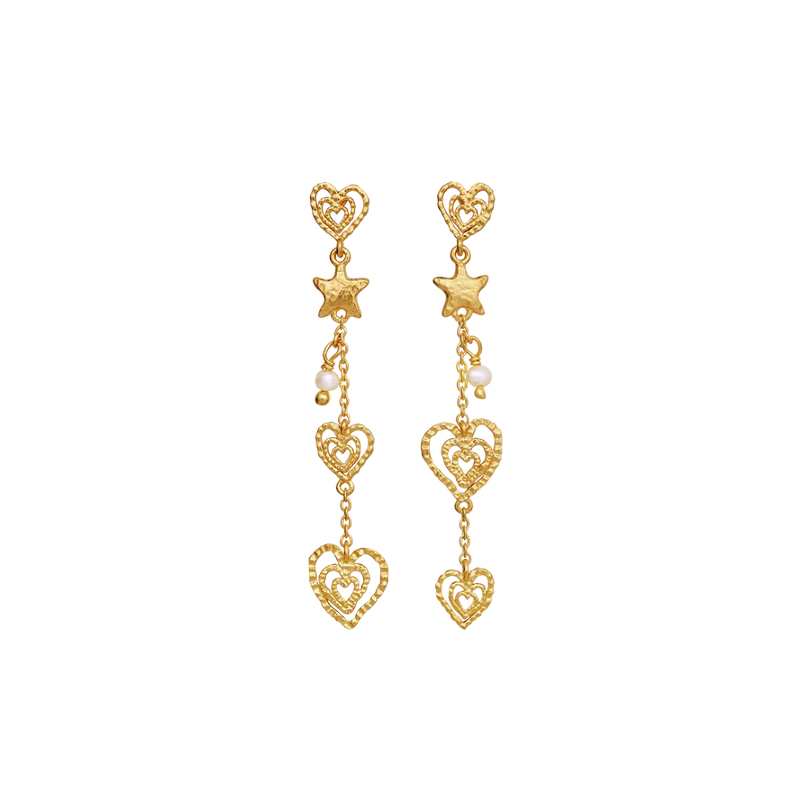 Maanesten Irena Øreringe forener fred, kærlighed og harmoni i et poetisk design. Små hjerter og rolige stjerner falder let langs kæden og skaber et feminint og balanceret udtryk – som en stille påmindelse om skønhed i de små detaljer.