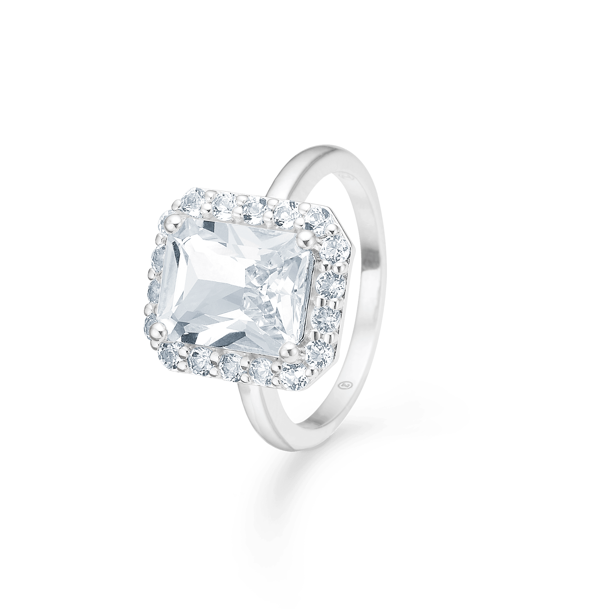 Ringen er udført i sølv og prydet med iøjnefaldende facetslebne hvide topaser, der er indrammet af zirkonia. Denne kombination giver et udtryk, der er både markant og elegant, og skaber en smuk kontrast mellem de skinnende sten og det stilrene sølv. Ringen udstråler både tidløs elegance og et personligt præg, hvilket gør den til et perfekt valg for dem, der ønsker et sofistikeret design med et strejf af himmelsk skønhed.