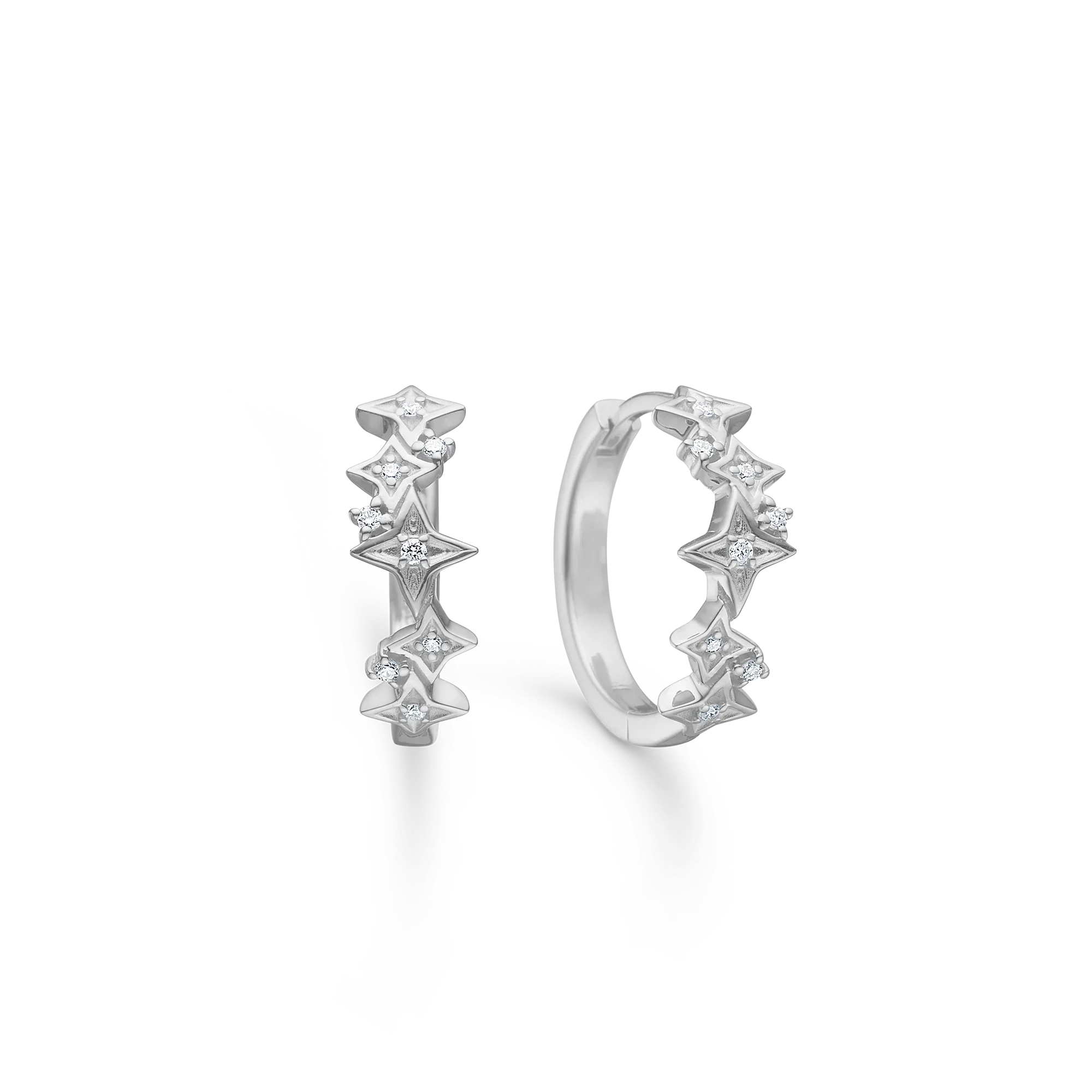 Vesper øreringene er skabt af Mads Ziegler med inspiration fra overgangen mellem dag og nat, hvor de første stjerner dukker frem. De femtakkede stjerneformer omsættes til et præcist, buet creol-bånd, hvor de små zirkonia-sten danner en diskret lyslinje. Kombinationen af poleret sølv og skarpe konturer skaber et roligt, fokuseret udtryk med et subtilt stjernetema, der bringer nærvær og elegance tæt på huden.