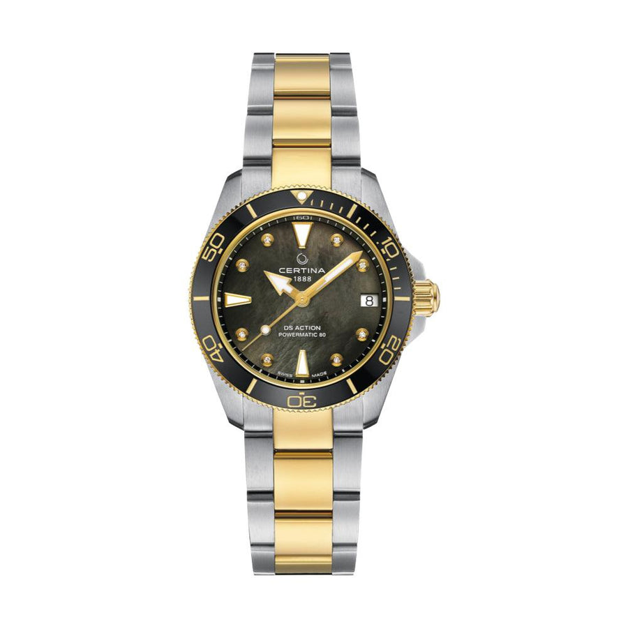Stilrent men rustikt dykkerur fra Certinas Action serie med sort urskive og keramik krans. Uret er kun 34,5 mm i omkreds og kan derfor passe til, kvinden der vil have et lækkert kvalitetsur. Uret er med skrue krone og vandtæt til 300m så uret kan bruges til dykning.  Diamanterne på skiven og den sorte perlemorsskive giver et lækkert feminint look. På skiven er viserne og få timemarkeringer med super LumiNova som får det til at lyse i mørket. Et helt fantastisk ur til det aktive friluft menneske.