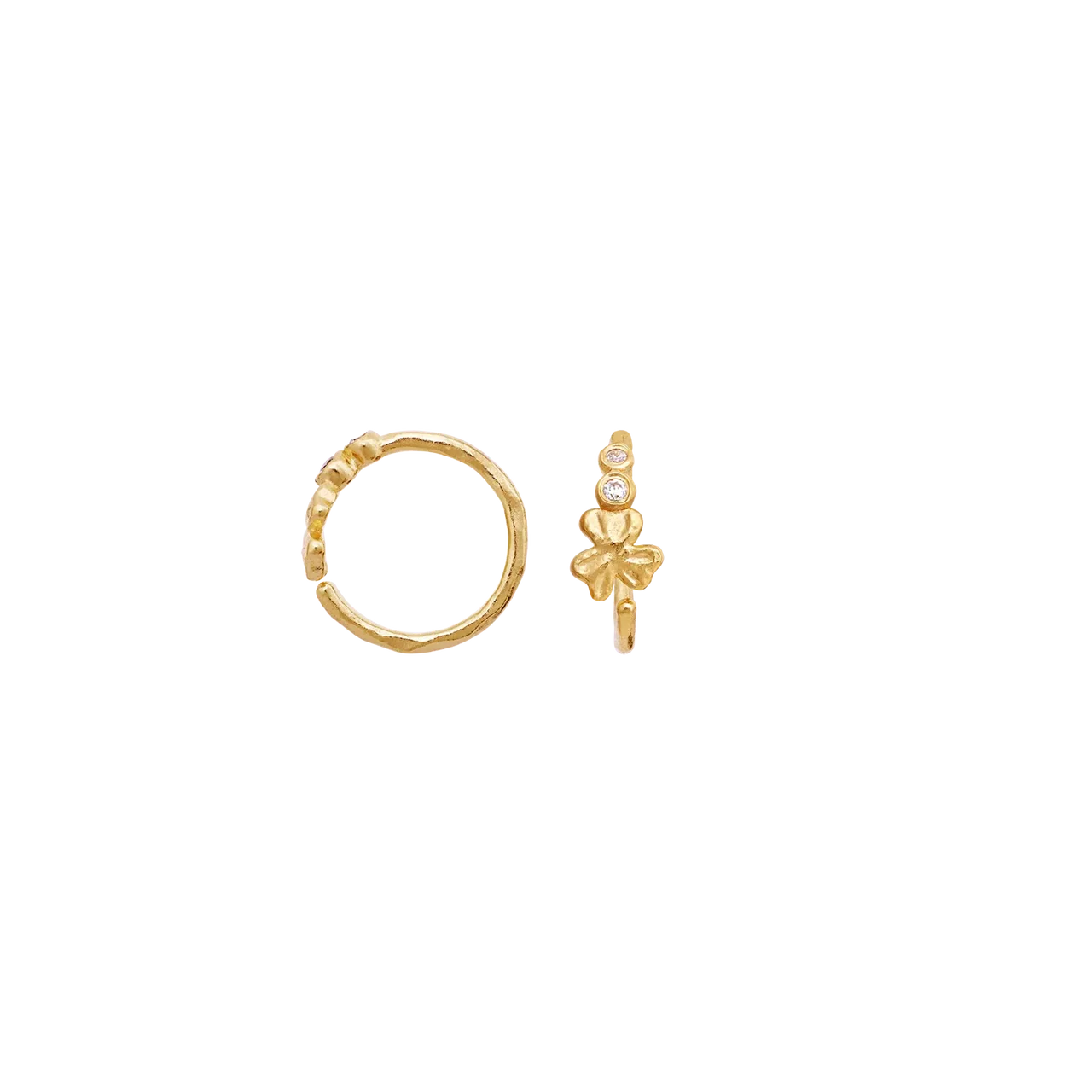 De små kløvere får et elegant løft af den varme, gyldne forgyldning og de funklende hvide zirkonia, som giver et let og feminint udtryk. Øreringene er perfekte alene som et diskret statement – eller sammen med andre forgyldte smykker, hvis du ønsker et mere personligt lag-på-lag look. En del af Maanesten SS26 kollektionen med fokus på symbolik og fine detaljer.