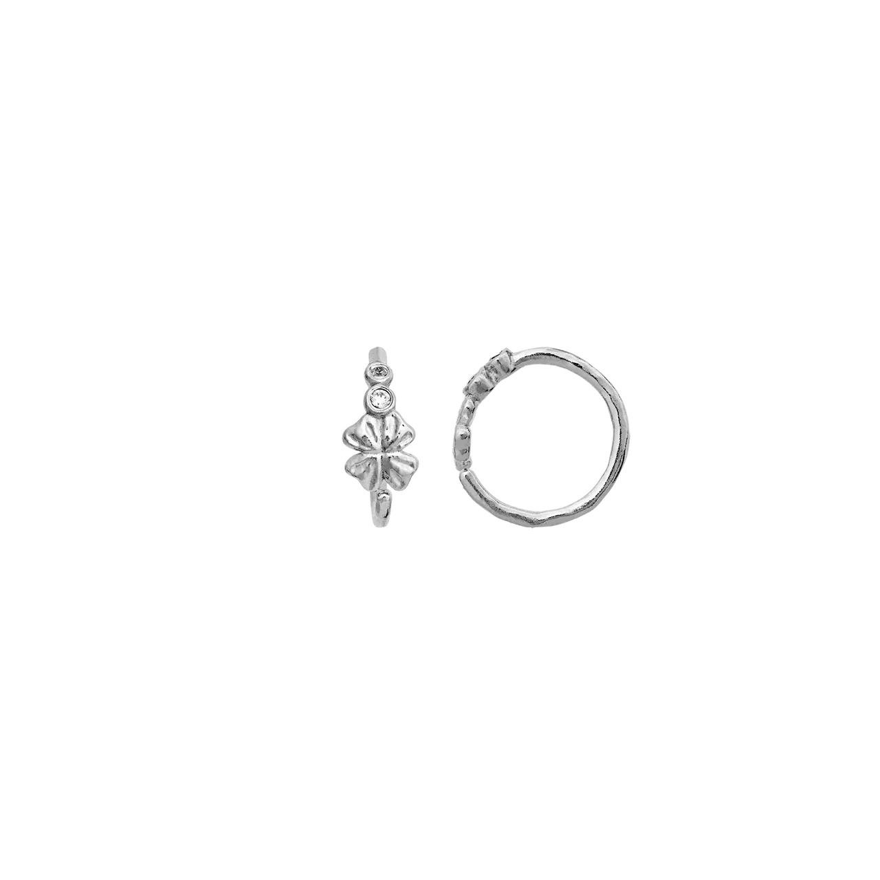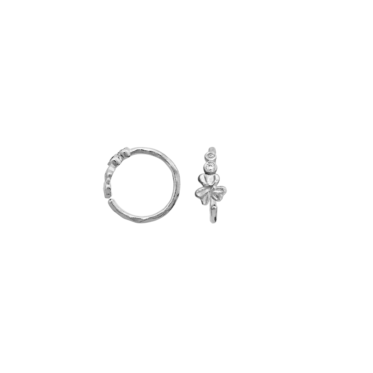 De små kløvere får et elegant og let udtryk i det kølige sølv, mens de funklende hvide zirkonia tilfører et diskret glimt. Øreringene er perfekte alene som et feminint og betydningsfuldt statement – eller sammen med andre sølvsmykker for et personligt lag-på-lag look. En del af Maanesten SS26 kollektionen med fokus på symbolik og fine detaljer.