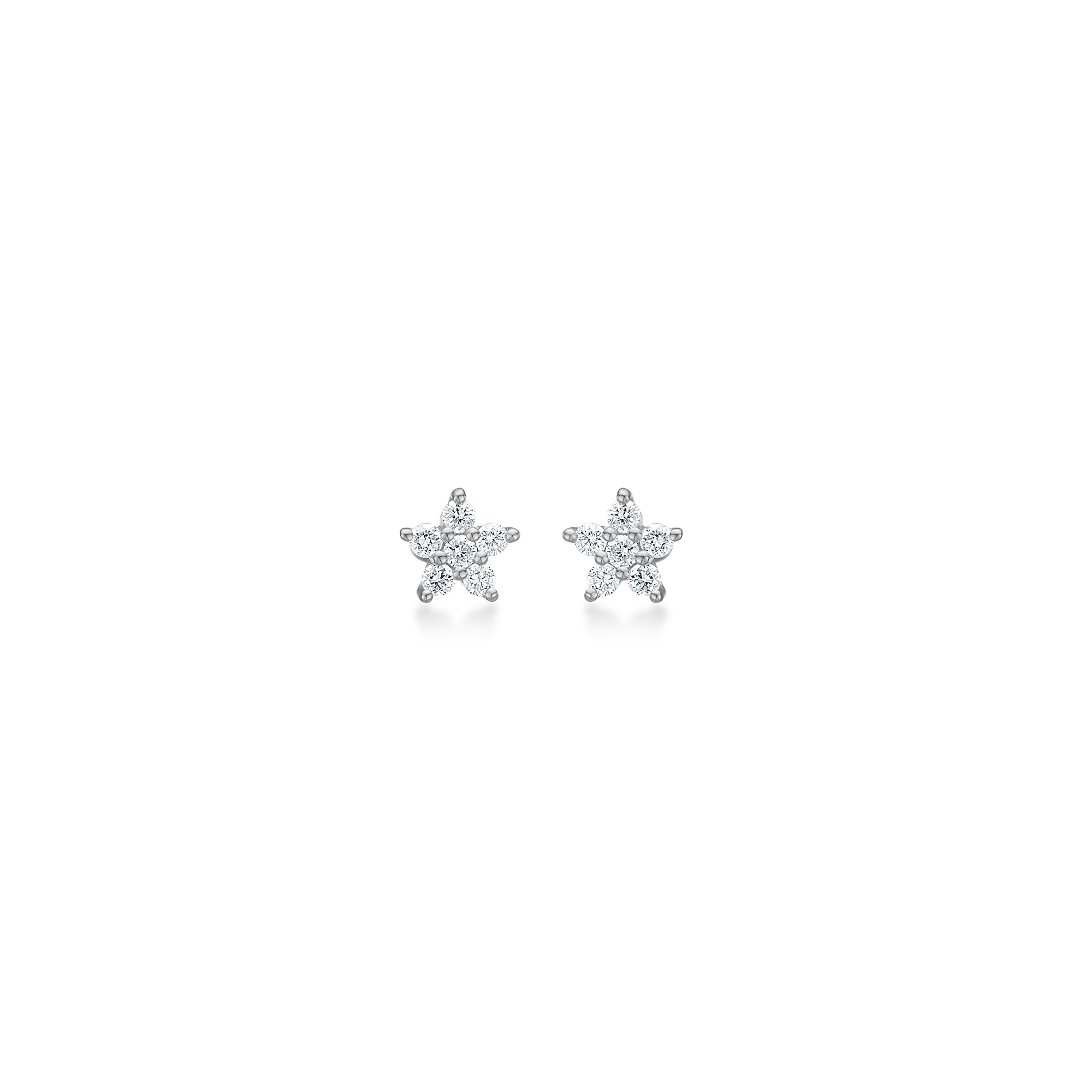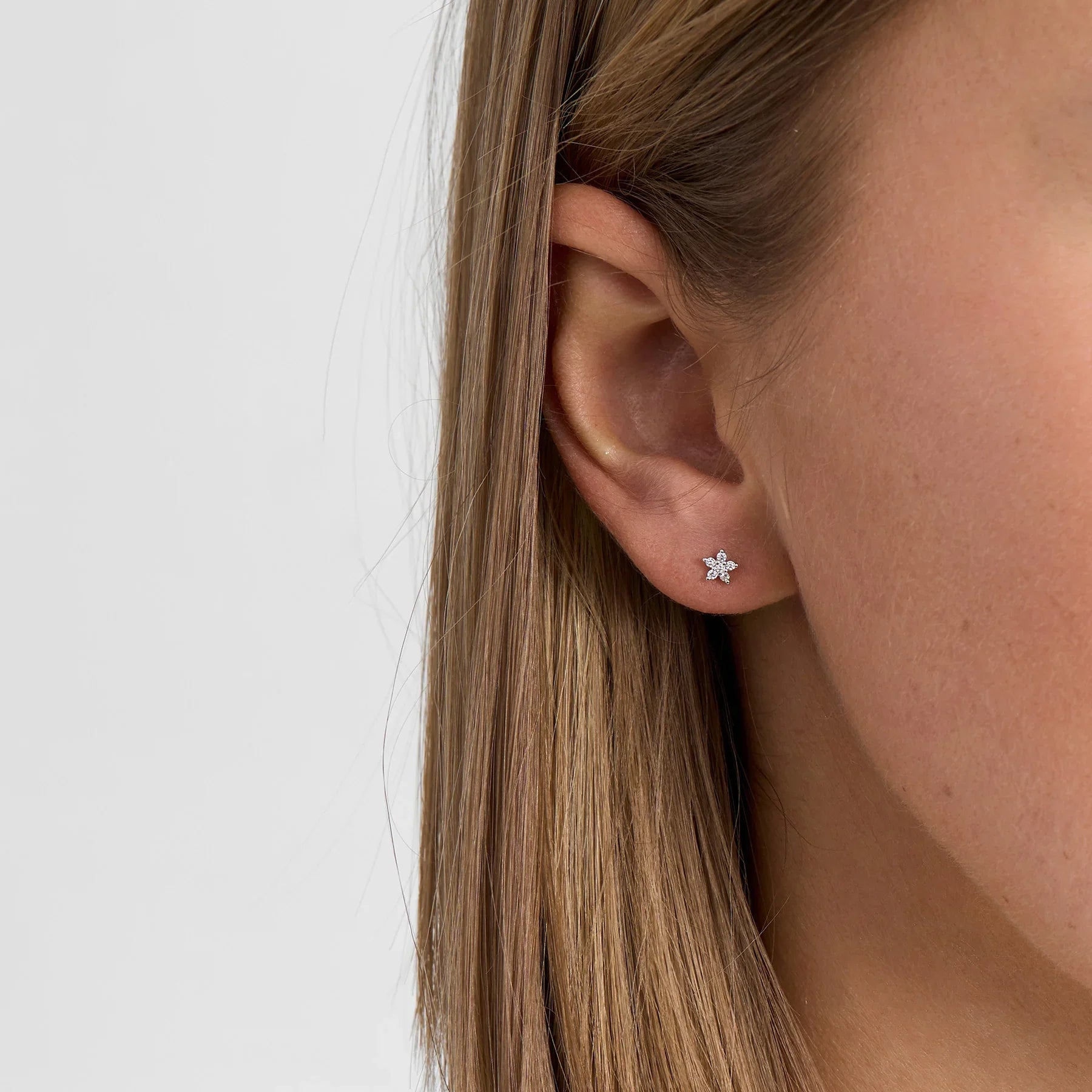 Fine og elegante ørestikker i poleret sterlingsølv med klare, facetslebne zirkonia, arrangeret som en grafisk roset. Øreringene måler 4 mm og kombinerer minimalistisk design med subtilt lysspil.