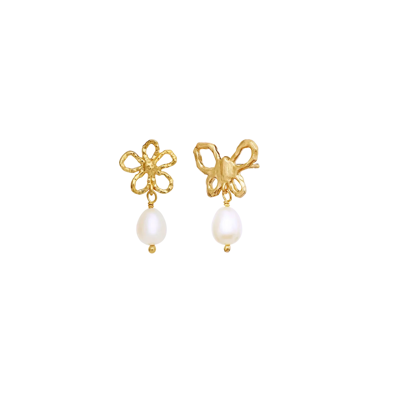 Det organiske design kombineret med en blød ferskvandsperle giver øreringene et romantisk og nostalgisk udtryk. Den varme 18 kt. forgyldning tilfører en gylden glød, som fremhæver perlernes naturlige skær og giver smykket et feminint og elegant udtryk. En del af Maanesten SS26 kollektionen med fokus på symbolik og sommerens poesi.