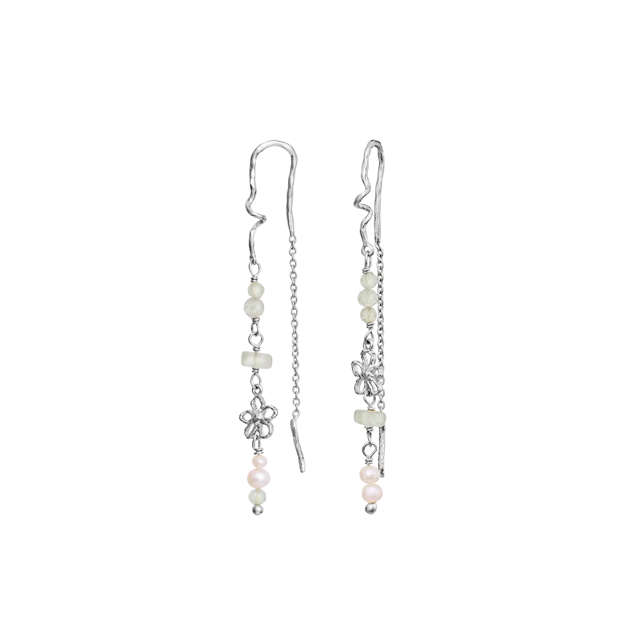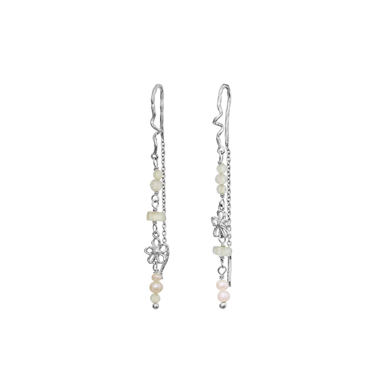 Designet er en kædeørering på bøjle, der giver et let og luftigt fald. Kombinationen af den kølige sølvglans, den bløde ferskvandsperle og den sarte prehnit skaber et poetisk og naturligt udtryk. En del af Maanesten SS26 kollektionen med fokus på organiske former og sommerlig lethed.