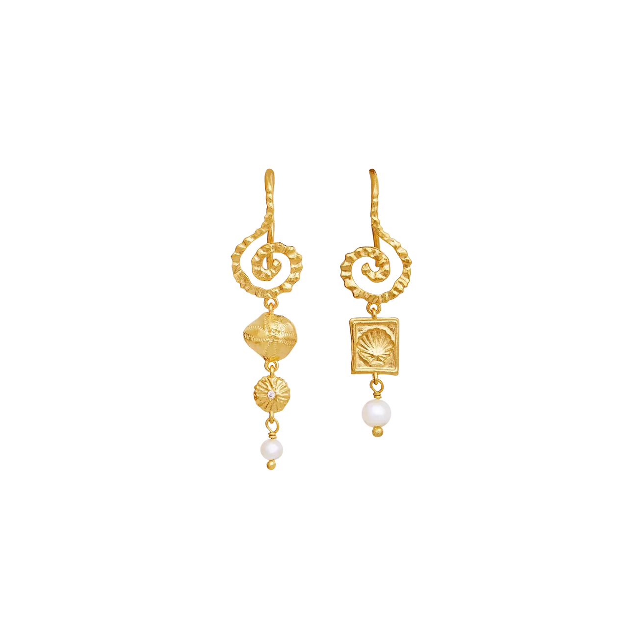 Den varme 18 kt. forgyldning fremhæver de organiske former, mens hvid zirconia og ferskvandsperle tilfører et fint og levende lys. Bøjleformen giver et moderne og let udtryk, der bevæger sig smukt og føles elegant både til hverdag og fest. En del af Maanesten SS26 kollektionen med fokus på bevægelse, kontraster og personlig stil.