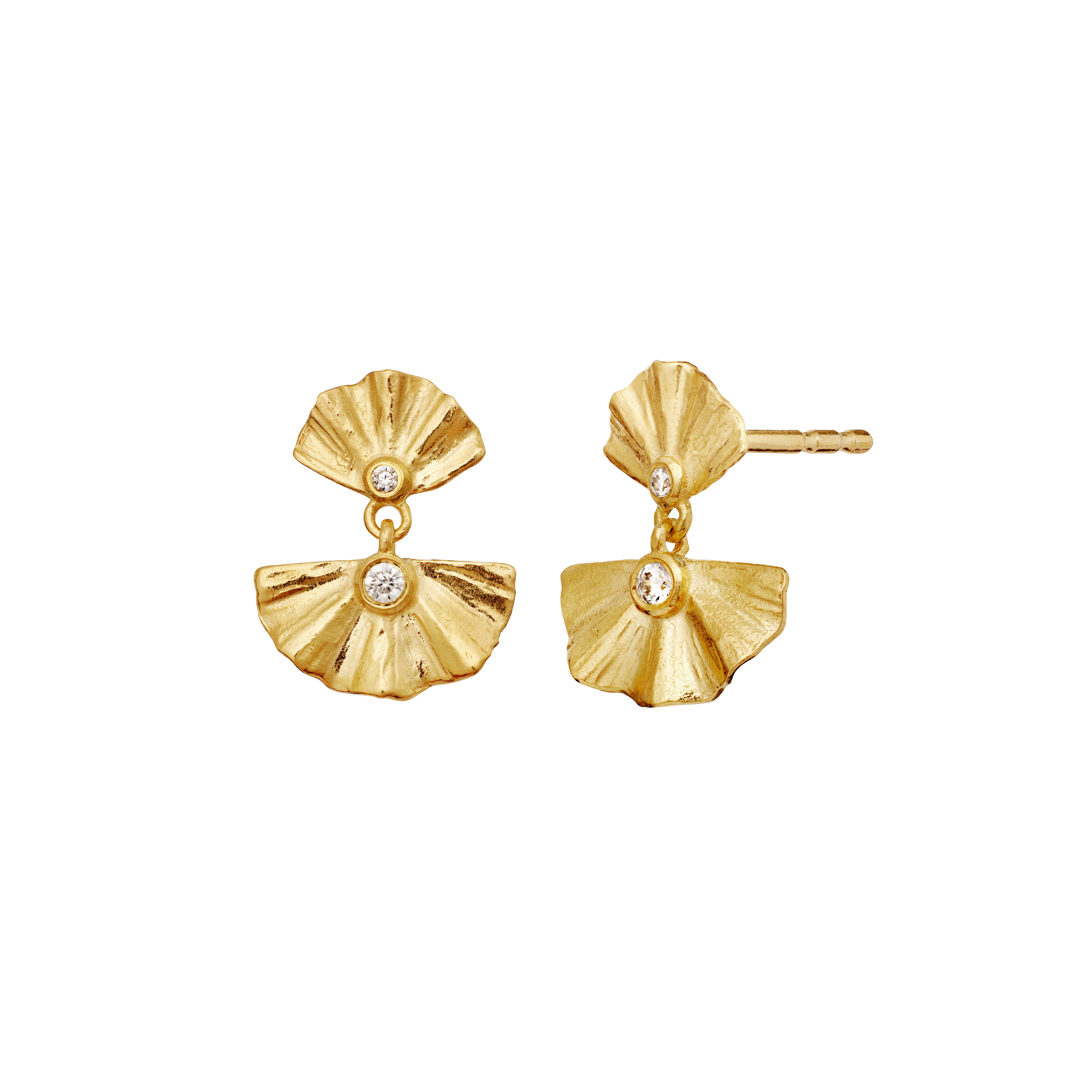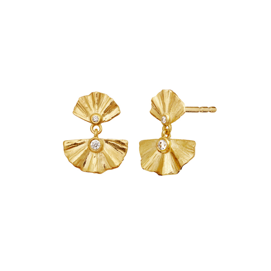 Maanestens Odile Forgyldte Øreringe fanger opmærksomheden med deres mystiske og elegante design. De vifteformede vedhæng, der er prydet med glimtende hvid zirconia, udstråler tidløs skønhed og luksus. Øreringene emmer af forførelseskunst og sofistikeret stil, der gør dem til et perfekt valg for den, der ønsker at udstråle selvsikkerhed og elegance. Den gyldne finish og det detaljerede design giver et eksklusivt udtryk, der kan bruges til både festlige begivenheder og som et statement i hverdagen.