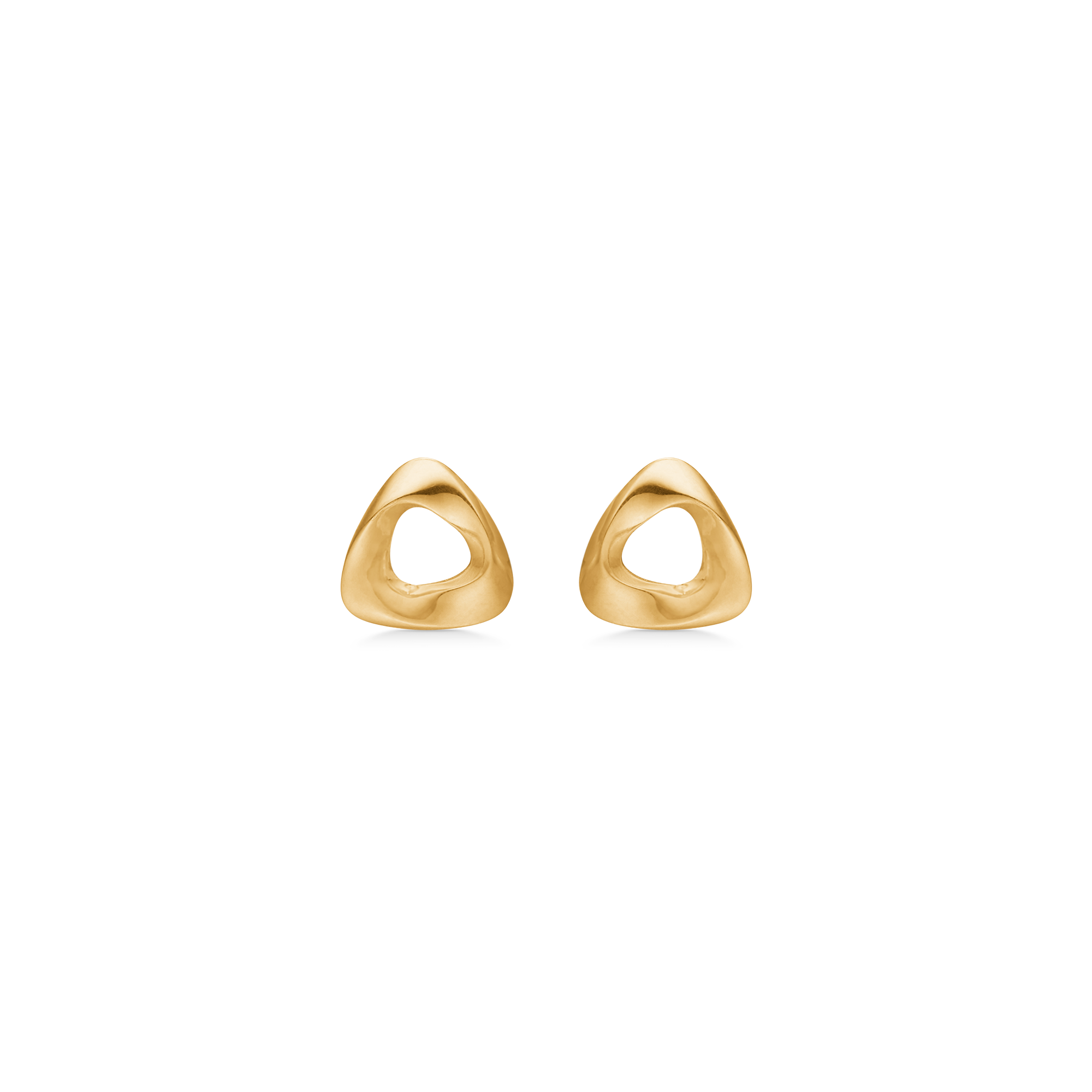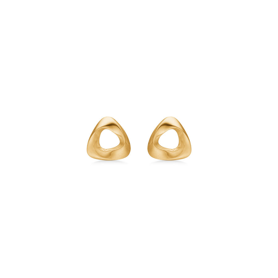 Designet kombinerer en blød trekantsilhuet med et let twist i guldet. Formen er afrundet og let asymmetrisk, hvilket skaber bevægelse og liv i smykket. Den åbne midte giver visuel lethed og lader huden være en del af udtrykket. Resultatet er øreringe, der føles både markante og elegante på samme tid.