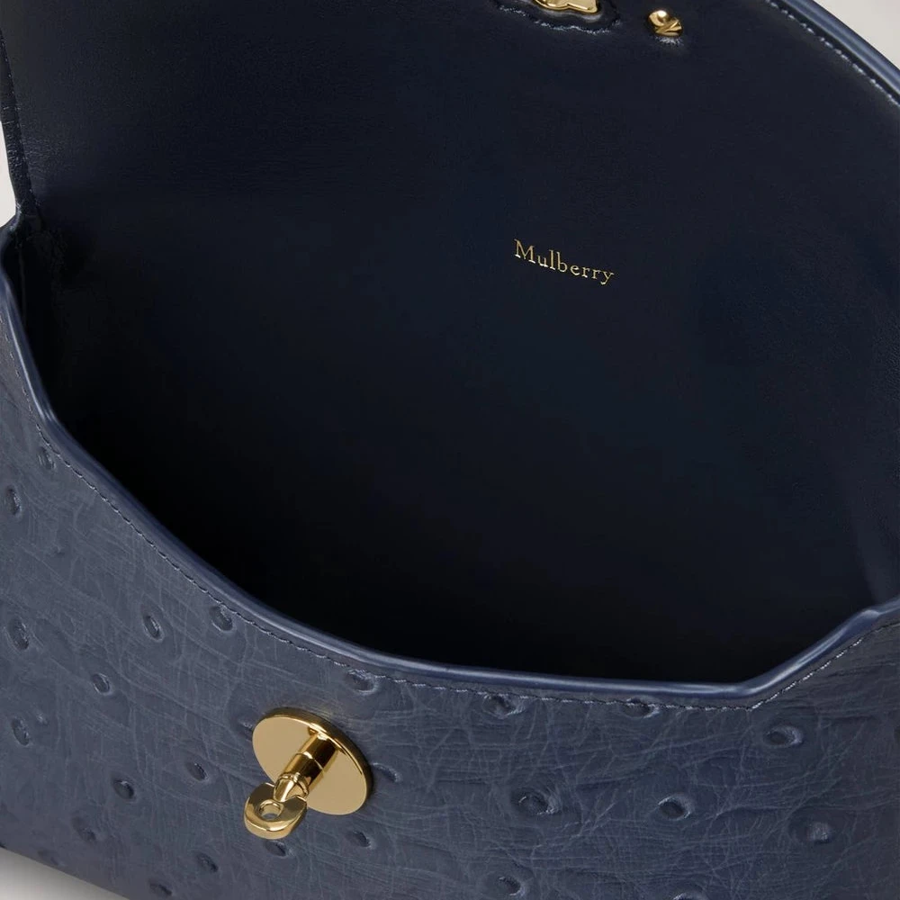 Pouch’en er designet i italiensk kalveskind med en glansfuld finish og håndpåført ostrich-embossing, hvilket gør hver enkelt taske unik. Den ikoniske Postman’s Lock på frontklappen fuldender looket og tilføjer et diskret Mulberry-touch af luksus.