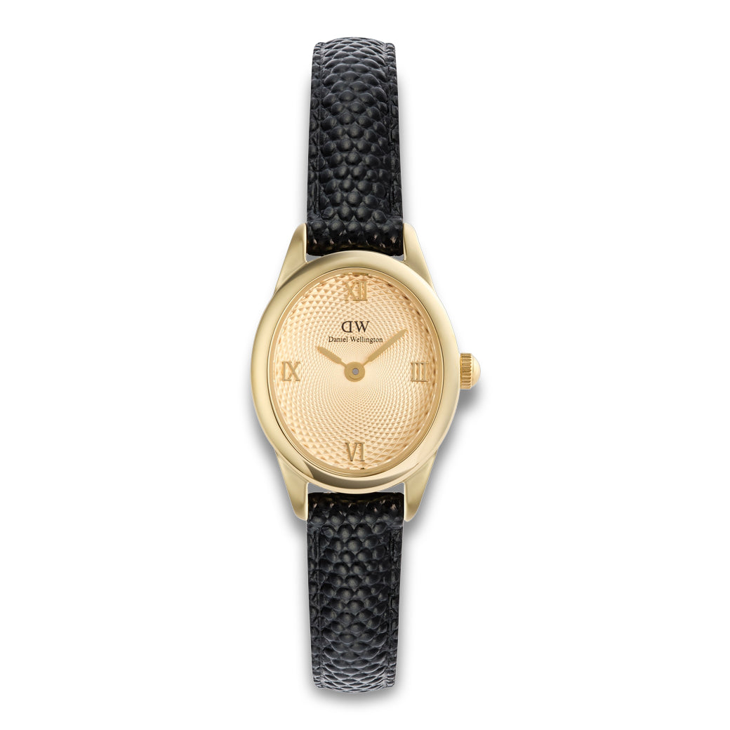 Daniel Wellington Ophelia Mini med oval urskive er en sofistikeret nyfortolkning af det klassiske design. Den bløde, ovale form tilfører et feminint og eksklusivt udtryk, mens den sorte læderrem skaber en elegant kontrast.