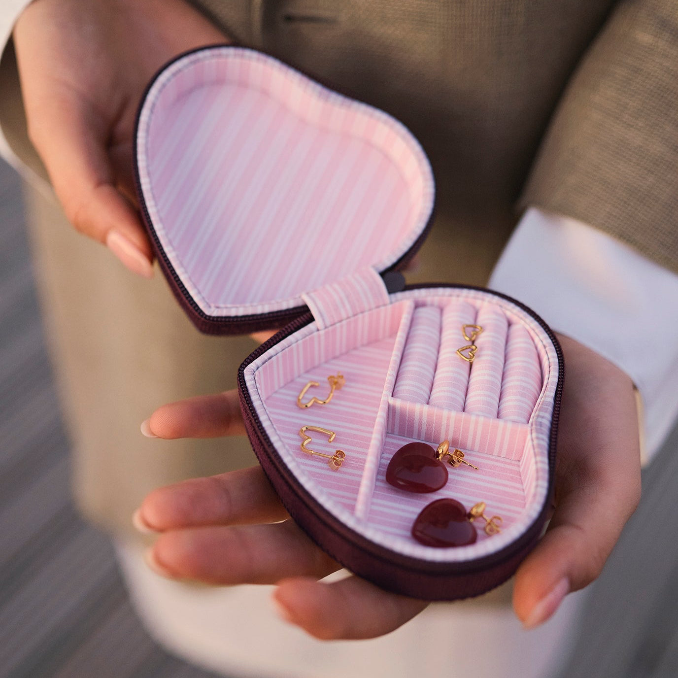Maanesten Heart Jewelry Box Maroon er et hjerteformet smykkeskrin skabt til at passe på netop de smykker, du holder allermest af. Den blødt afrundede hjerteform og den dybe maroon-røde farve giver smykkeskrinet et romantisk og elegant udtryk, der gør det til mere end bare opbevaring – men en del af historien bag dine smykker.