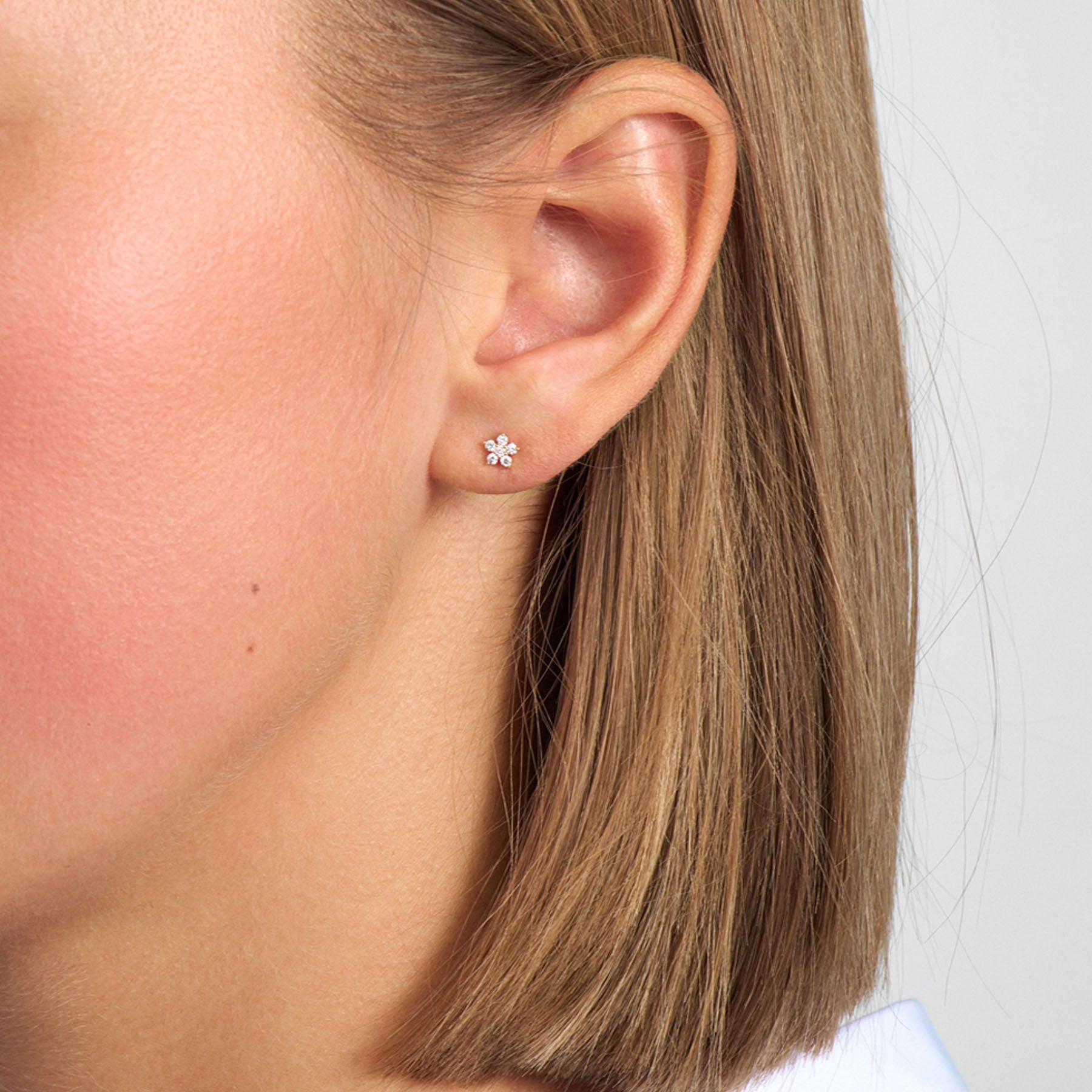 Mads Z Céleste ørestikker i 14 karat guld er elegante og eksklusive diamantøreringe med et raffineret, blomsterinspireret design. De seks brillanter på i alt 0,14 ct i kvalitet W/SI samles i fine grabber og danner en blødt afrundet silhuet, der måler 5 mm.