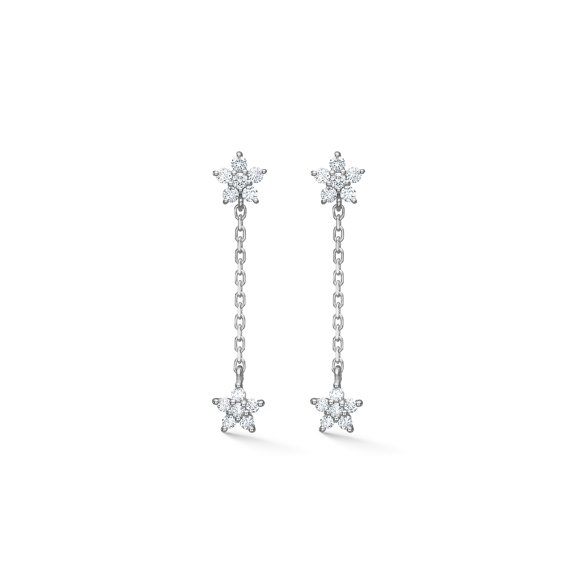 Den ene stjerne sidder foran på øret, mens den anden placeres bag øreflippen. Den smalle kæde forbinder dem og giver et diskret, levende udtryk. Det polerede sølv understreger den nordiske enkelhed og giver øreringene et moderne og grafisk look, som stadig føles blødt og feminint.