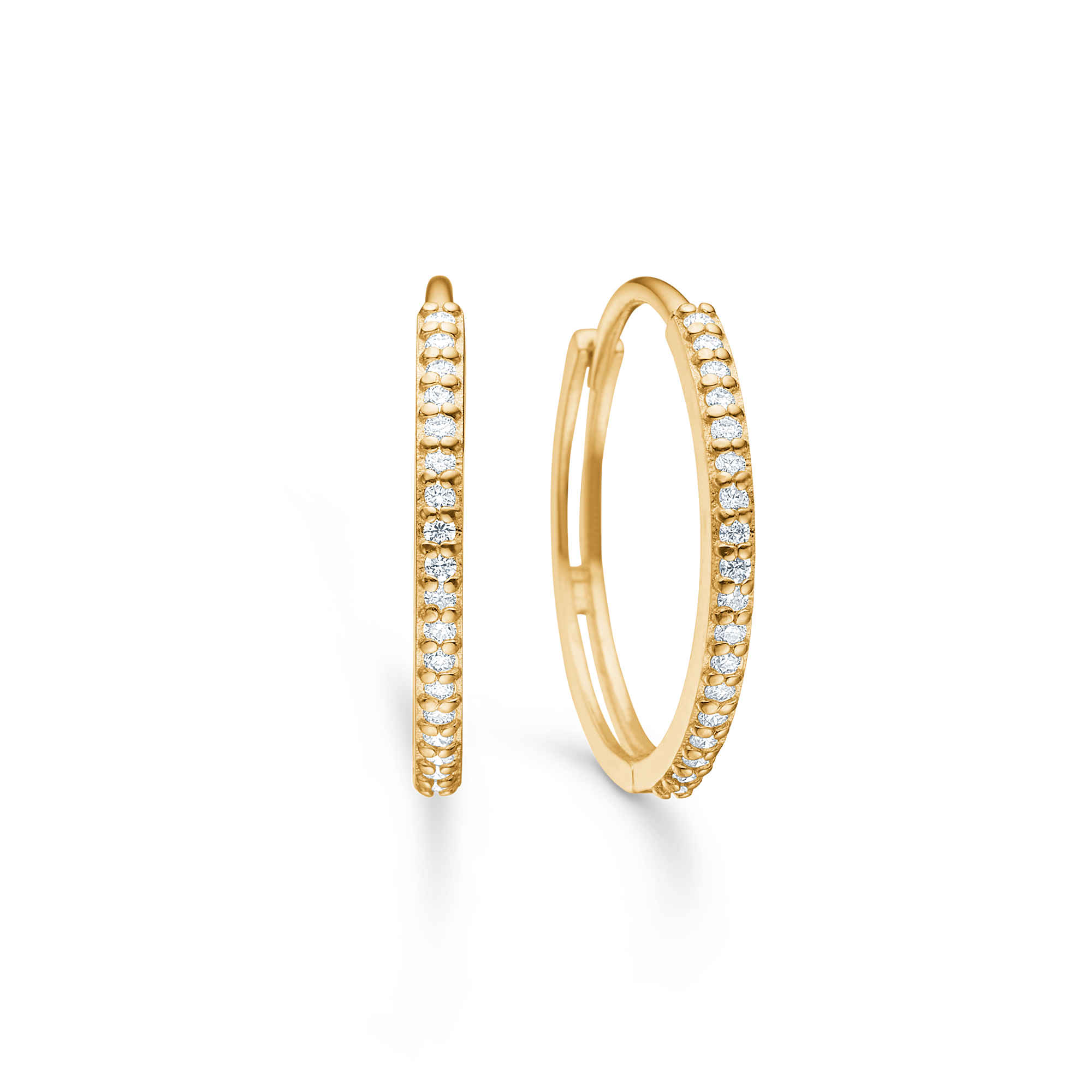 Brillanterne er pavéfattede langs ydersiden og danner en ubrudt række af lys. Det giver et kontrolleret og harmonisk lysspil, som fremhæver cirklens form uden at virke overdrevet. Den polerede guldoverflade understøtter diamantens glans og giver øreringene et roligt og luksuriøst udtryk.