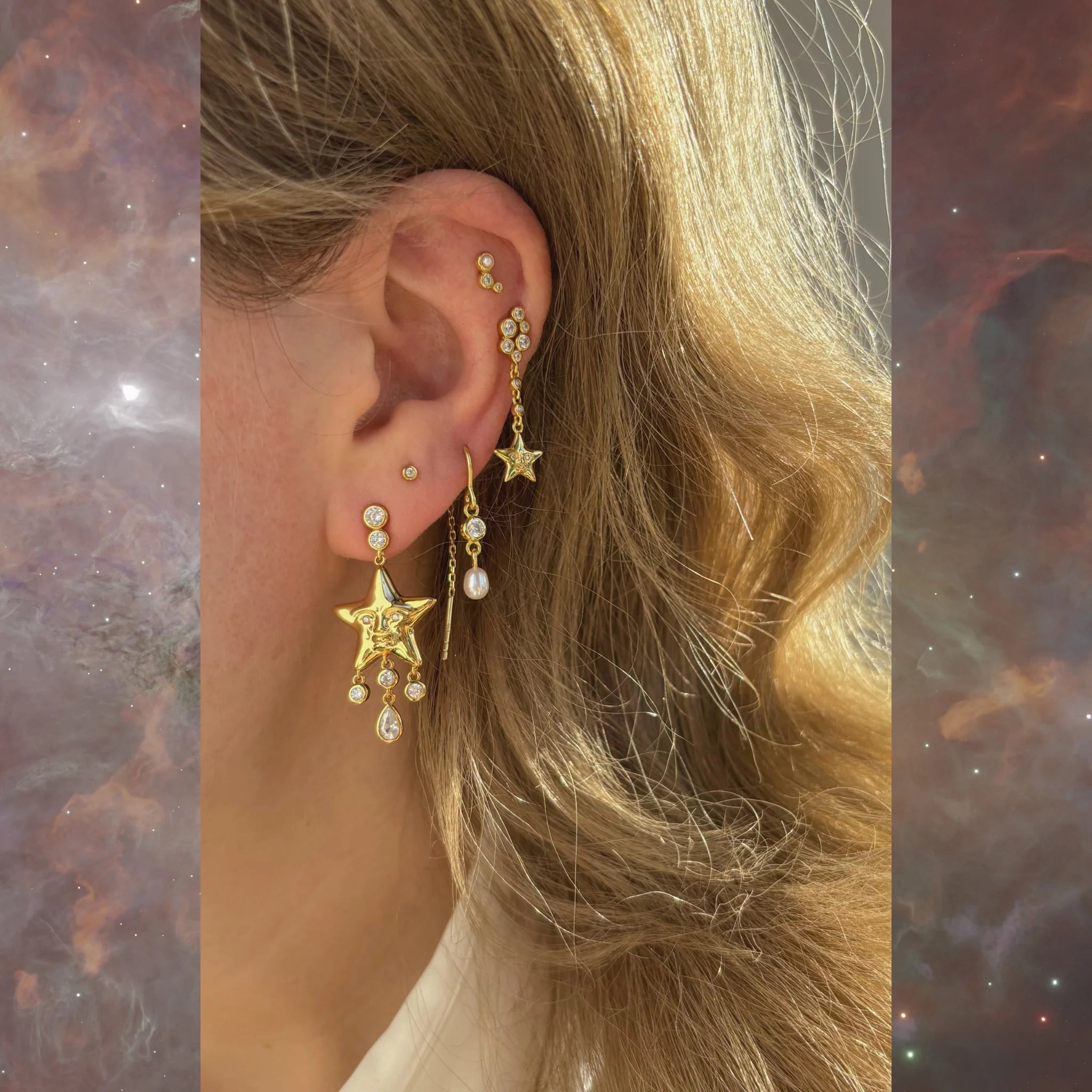 Fra ørestikken hænger en stor, dekorativ stjerne med et charmerende ansigt, der giver smykket et fantasifuldt og personligt udtryk. Under stjernen bevæger små vedhæng med funklende zirkonia og en dråbeformet sten sig let, hvilket skaber en elegant bevægelse og ekstra glans.