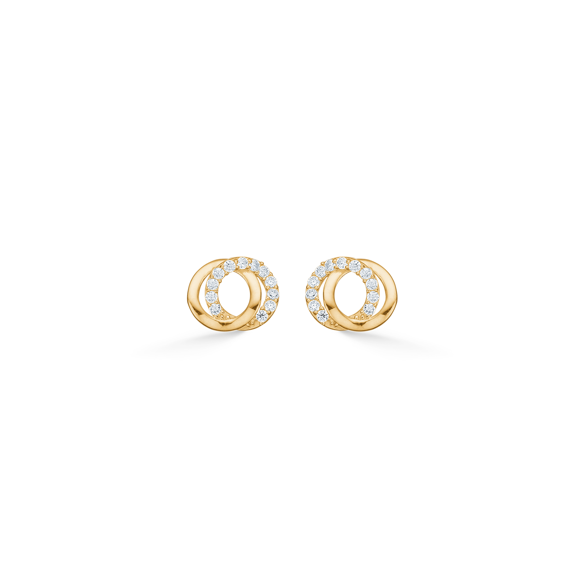 Mads Z Rhea ørestikker i 8 karat guld kombinerer skandinavisk elegance med et moderne formsprog. De to sammenflettede cirkler skaber et feminint og harmonisk udtryk – den ene i blankpoleret guld og den anden smukt besat med klare, brillantslebne zirkonia.
