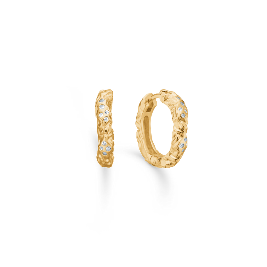 Glint øreringe i 925 sterlingsølv med 18 kt. forgyldning og klare zirkoniaer. Den bølgende, blanke overflade fanger lyset smukt, mens de små zirkoniaer giver et diskret glimt, inspireret af is og vintervand. Øreringene måler 14 mm og kan bæres alene eller styles med andre øreringe for et personligt look.