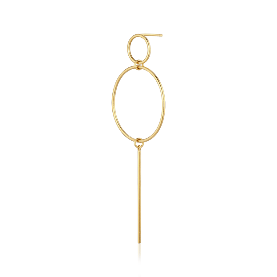 Øreringen er designet med to lette ringe, der skaber en smuk og luftig silhuet. Fra den store ring falder et slankt vedhæng, som giver øreringen en elegant længde og en fin bevægelse, når den bæres. Den forgyldte overflade giver smykket et stilrent og feminint udtryk.
