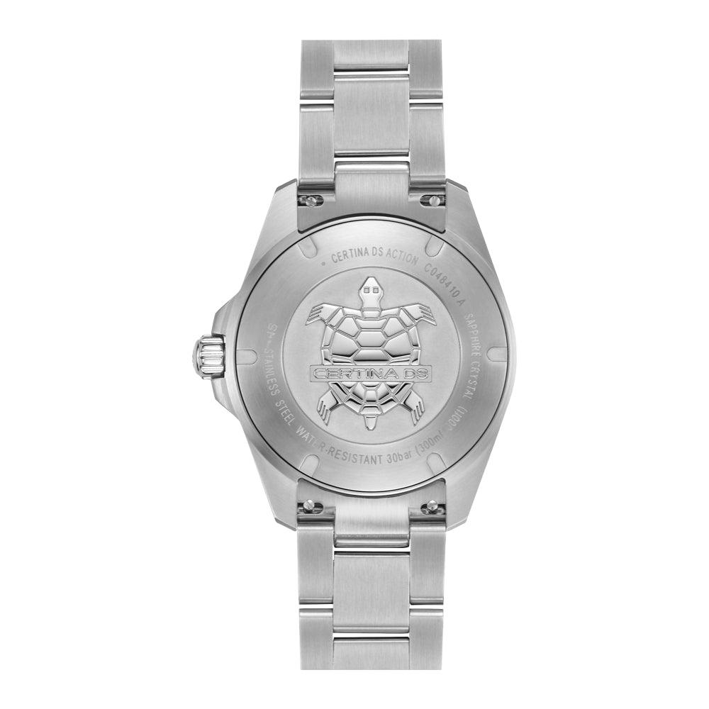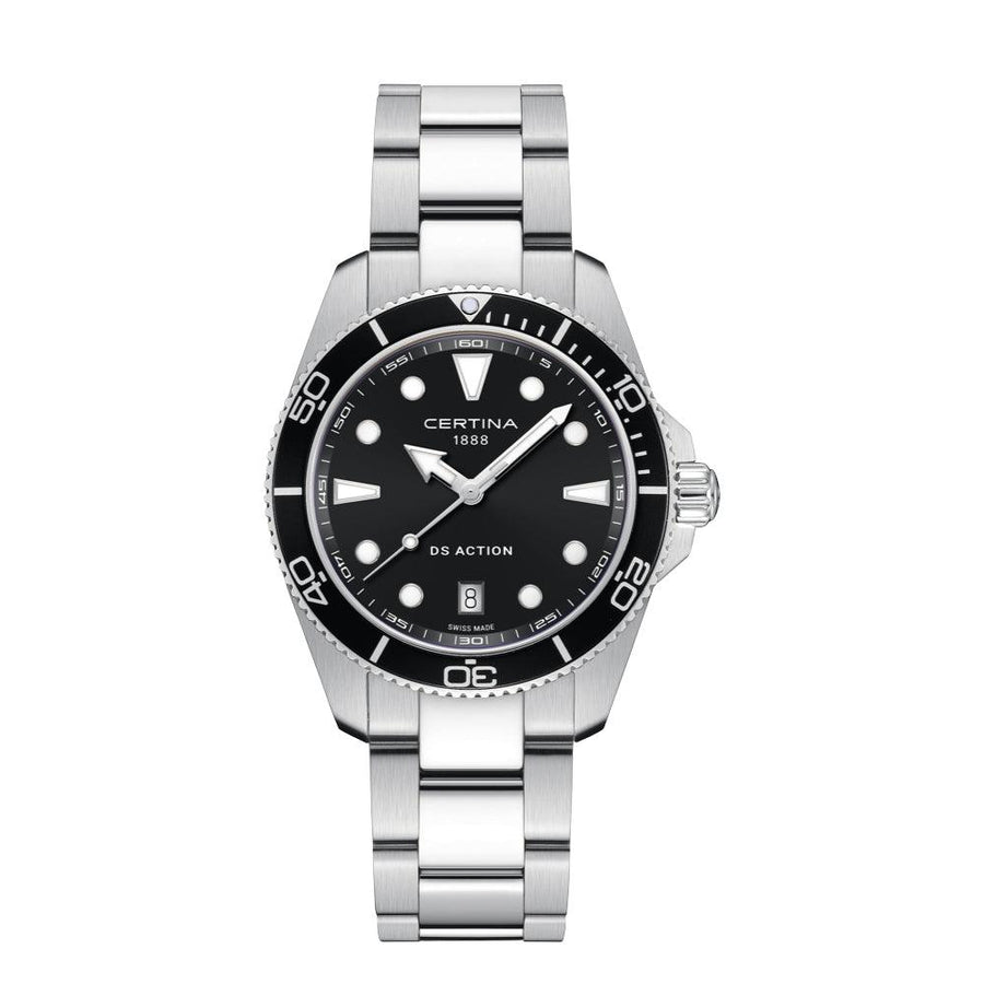 Robust og stilrent dykkerur fra Certinas Action-serie med sort urskive og rustfri stålkrans. Uret har en diameter på 40 mm og er ideelt til mænd, der ønsker et funktionelt og sporty kvalitetsur. Med skruekrone og en vandtæthed på 300m er det perfekt til dykning og andre vandsportsaktiviteter. Super-LumiNova på timemarkeringerne sikrer god synlighed i mørke, mens det præcise Precidrive™ Quartz-værk garanterer en pålidelig tidtagning. Et fremragende valg for den aktive eventyrer.