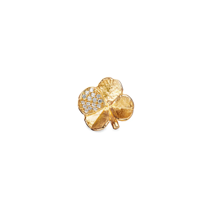 Denne elegante firkløver pin fra Flora Danica er håndlavet i 100 % genanvendt sterlingsølv og belagt med 22 karat forgyldning. Et af de fire blade er smykket med 16 håndsatte zirkoner, der tilføjer et sofistikeret glimt til designet. Inspireret af en ægte firkløver, plukket i Danmark i 1950'erne, symboliserer pinnen tro, håb, kærlighed og held.