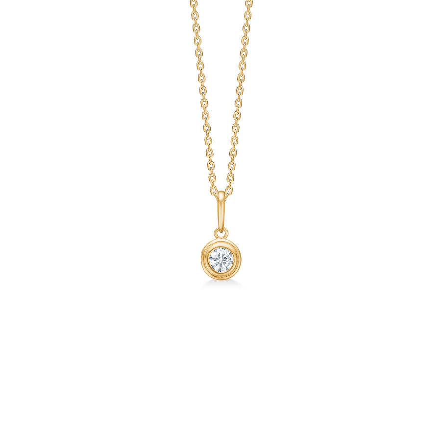 I centrum ligger en klar, rund facetslebet zirkonia, tæt omsluttet af en bezel-fatning. Den strukturerede krans omkring stenen skaber dybde og fremhæver det klare lys, mens den spejlblanke guldoverflade elegant reflekterer omgivelserne. Resultatet er et vedhæng med et præcist og fokuseret udtryk – feminint, raffineret og let at bære både til hverdag og særlige øjeblikke.