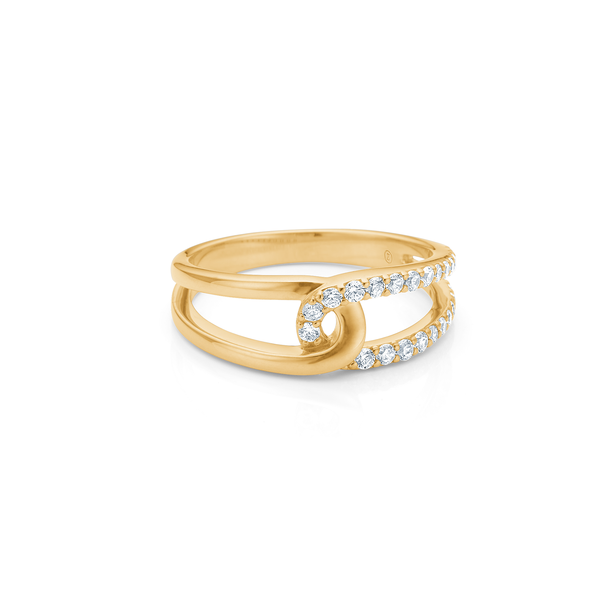 Langs den ene kurve funkler klare zirkonia i pavéindfatning og danner en sammenhængende lyslinje. Kontrasten mellem det glatte guld og de funklende sten fremhæver designets bevægelse og rummet mellem de to bånd. Resultatet er en forgyldt ring med karakter – moderne, feminin og fuld af personlighed.