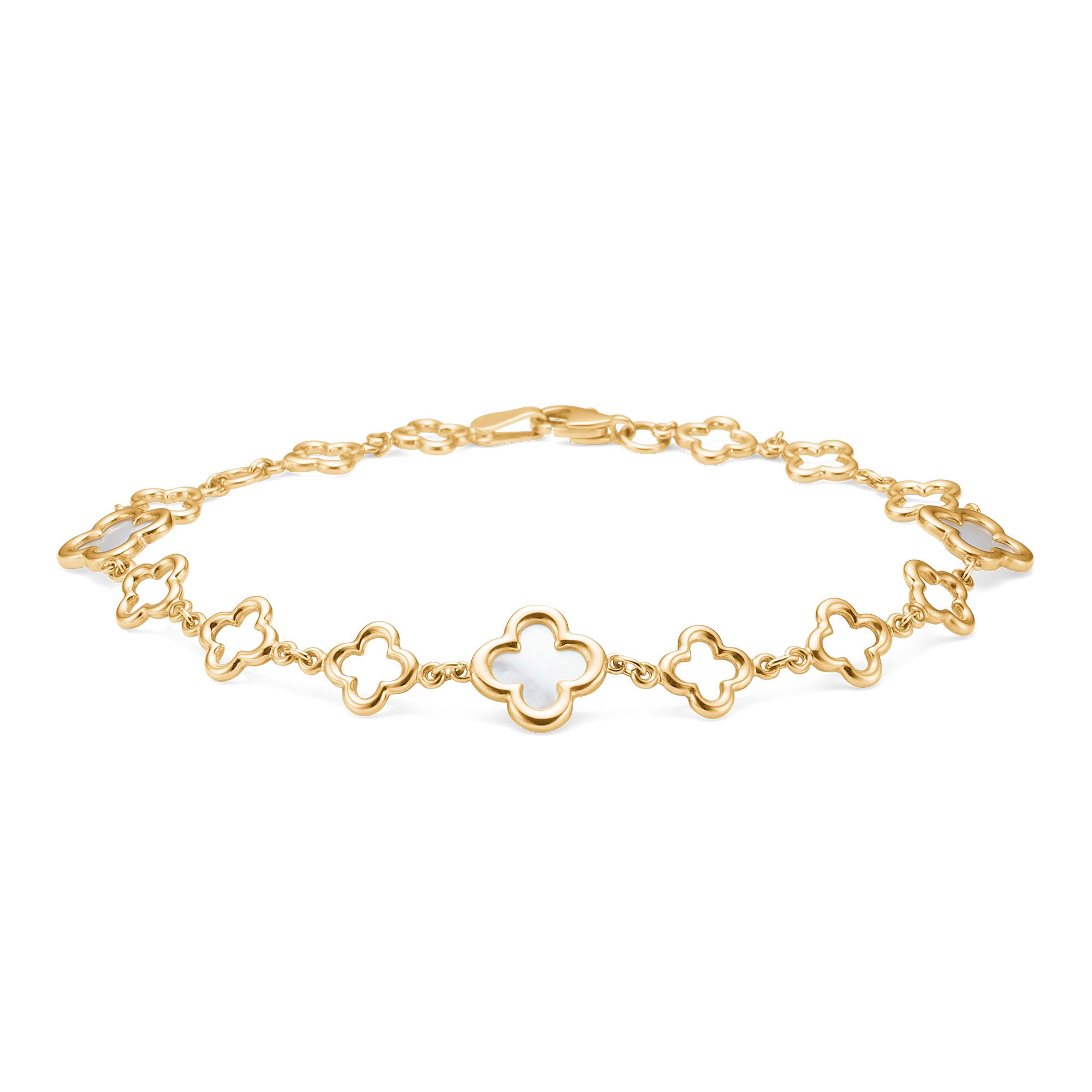 Tilfør et feminint og raffineret touch med Aurelia armbåndet fra Mads Z. Smykket er udført i 8 karat guld og består af små, åbne blomsterled, hvor tre af dem er smukt udfyldt med perlemor, hvilket giver et elegant og levende spil af lys og struktur.