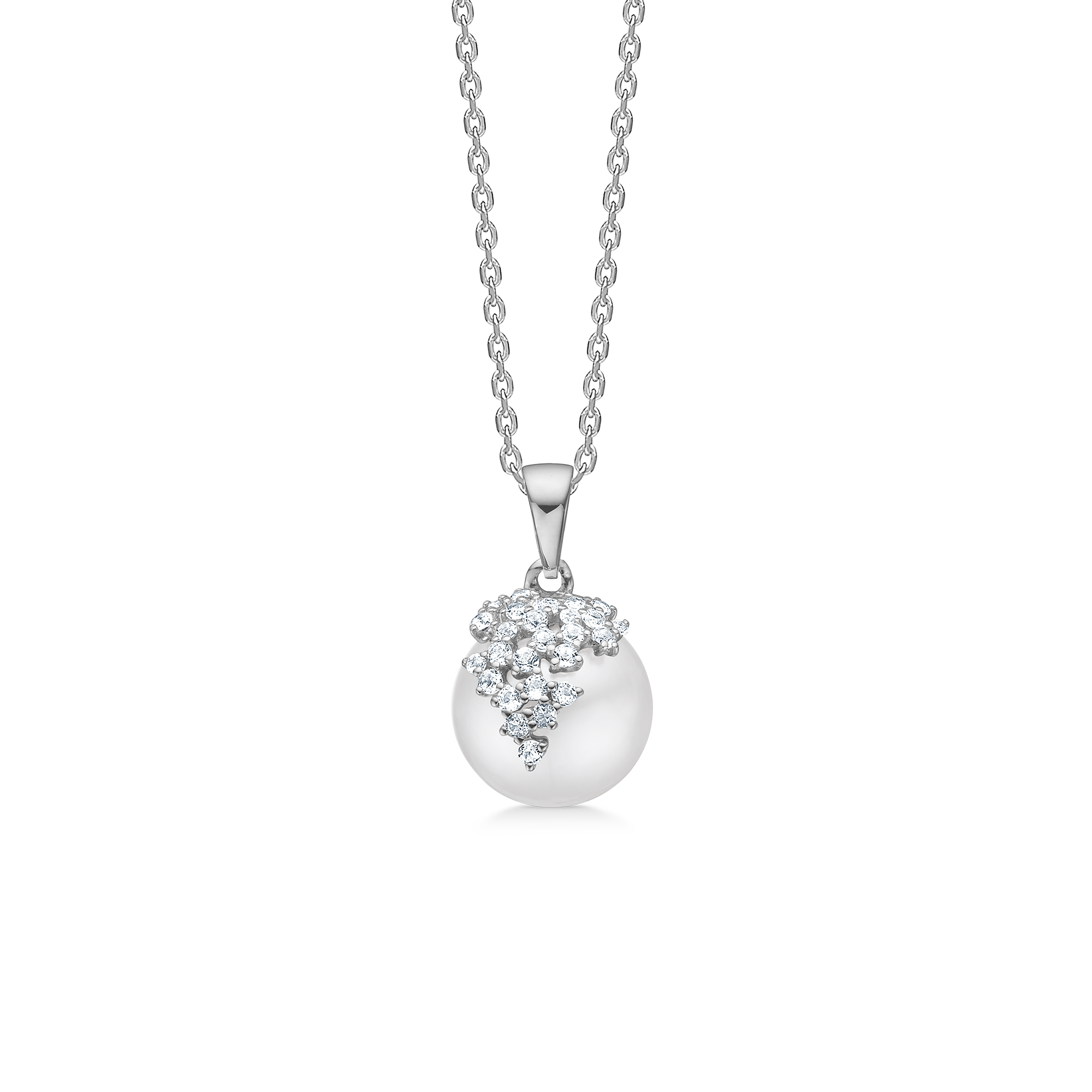 Elegant halskæde i poleret sterlingsølv med klare zirkonia og en smuk rund kulturperle. Den tynde kæde følger halsens naturlige linje, og måler 40 cm med 5 cm justerbar forlængelse, og vedhænget har en diameter på 10 mm.