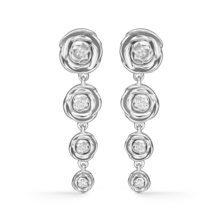Mads Z Sølv Rosalie Øreringe er et elegant sæt sølvøreringe. Hver ørering måler 38 mm og har fire roser arrangeret i rækker i fire forskellige størrelser.