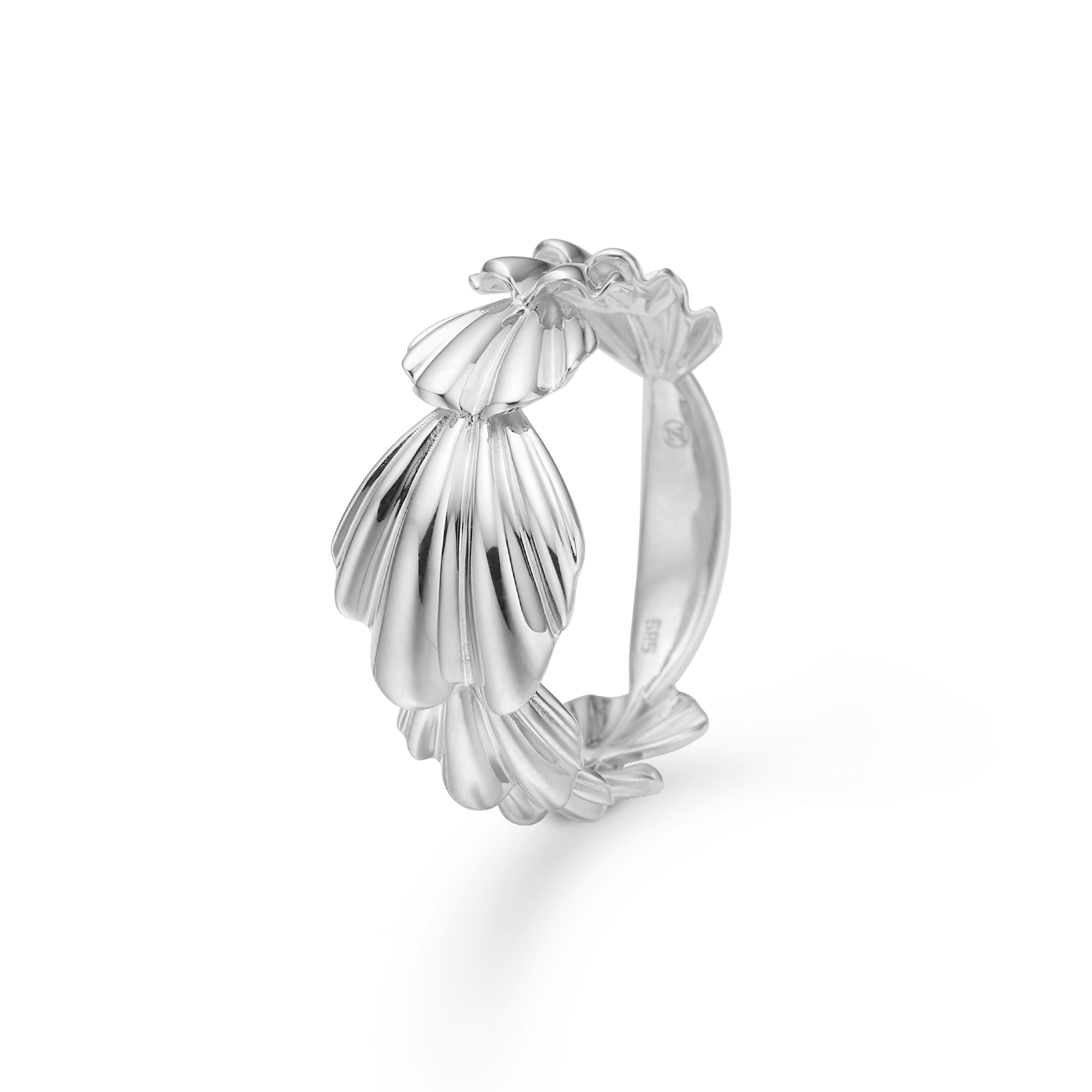 Elegant ring i sterlingsølv med bløde, vifteformede folder, der følger håndens naturlige konturer og fanger lyset smukt fra alle vinkler. Et skulpturelt smykke med subtil bevægelse og tidløs karakter.
