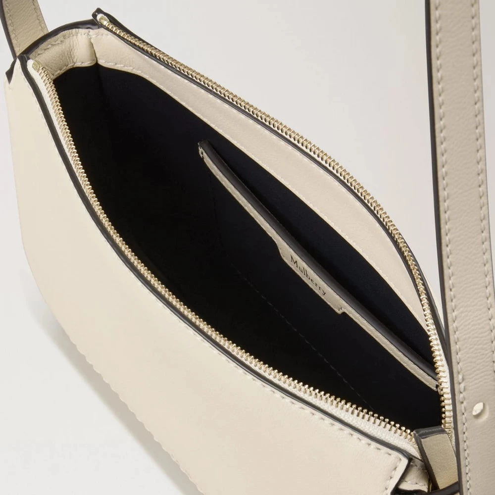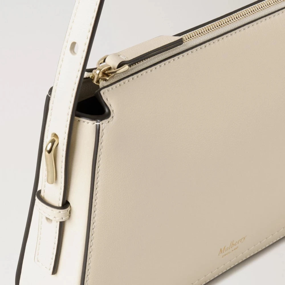 Tasken er fremstillet i eksklusivt Micro Classic Grain-læder i farven Eggshell (råhvid), som giver et lyst, elegant og luksuriøst udtryk. Den har en praktisk lynlåslukning, en aftagelig og justerbar skulderrem, samt fine soft gold-detaljer, der understreger det tidløse design. Det præget Mulberry-logo på forsiden tilføjer et diskret touch af eksklusivitet.