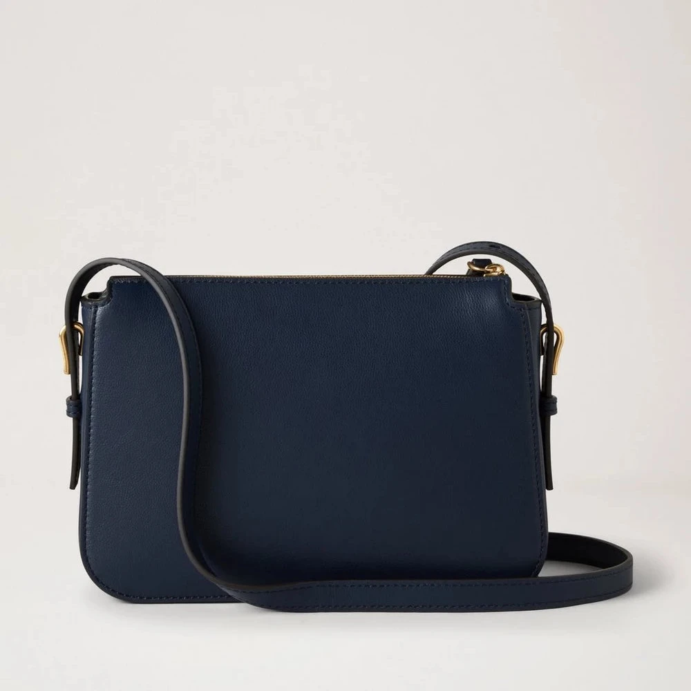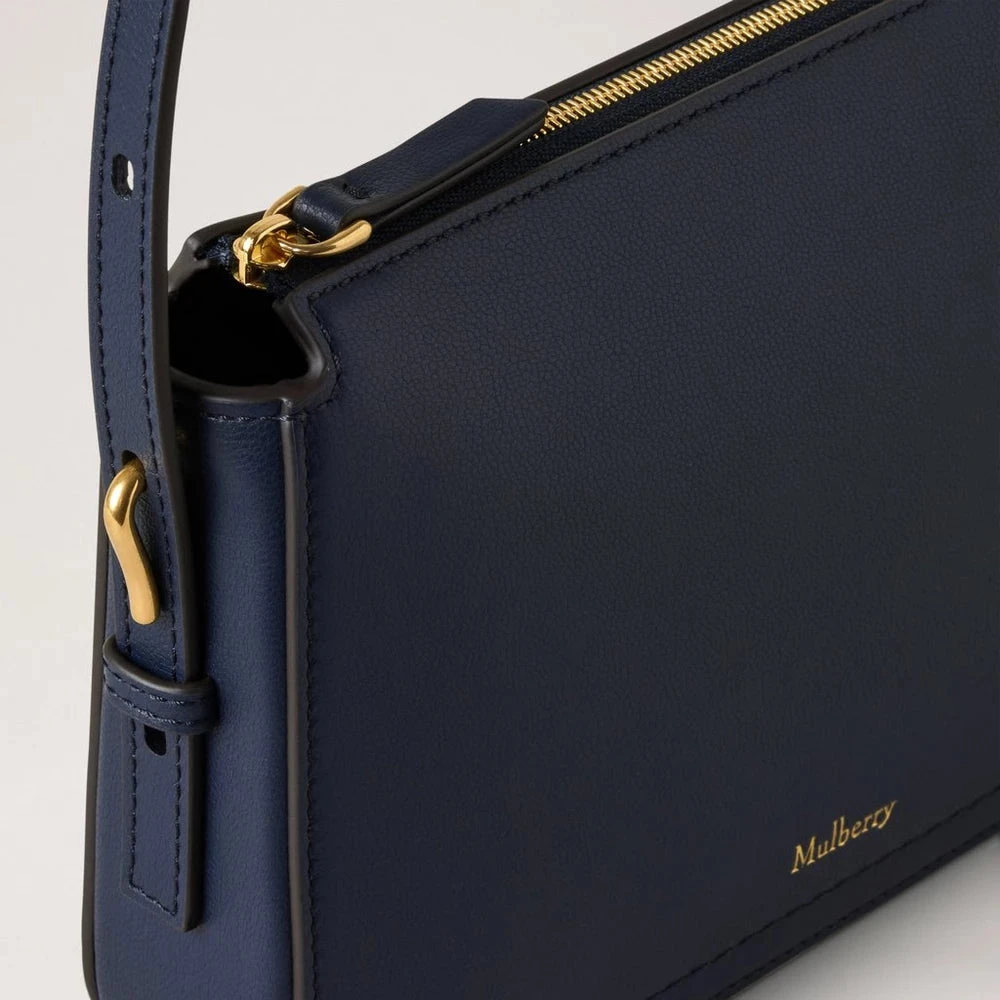 Tasken er fremstillet i eksklusivt Micro Classic Grain-læder i farven Night Sky (mørkeblå), som giver et lyst, elegant og luksuriøst udtryk. Den har en praktisk lynlåslukning, en aftagelig og justerbar skulderrem, samt fine soft gold-detaljer, der understreger det tidløse design. Det præget Mulberry-logo på forsiden tilføjer et diskret touch af eksklusivitet.
