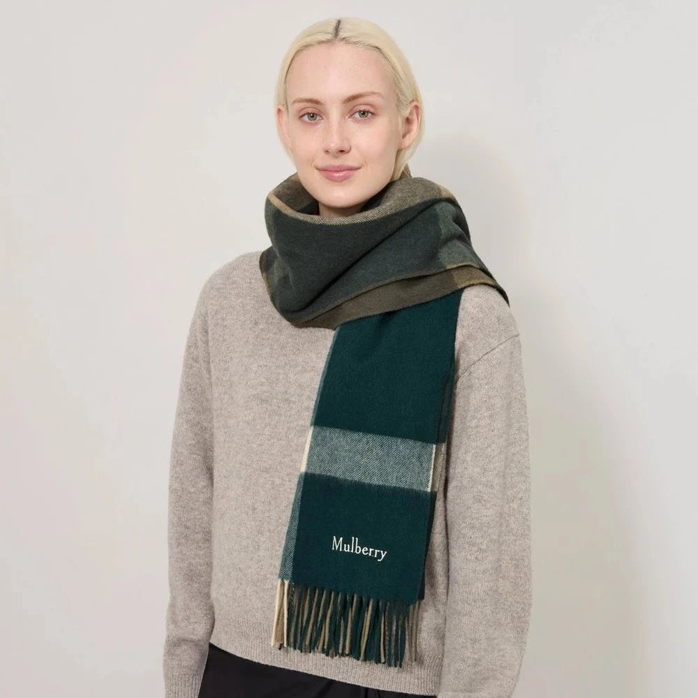 Mulberry Large Check Merino Wool Scarf Mulberry Green & Juniper Green