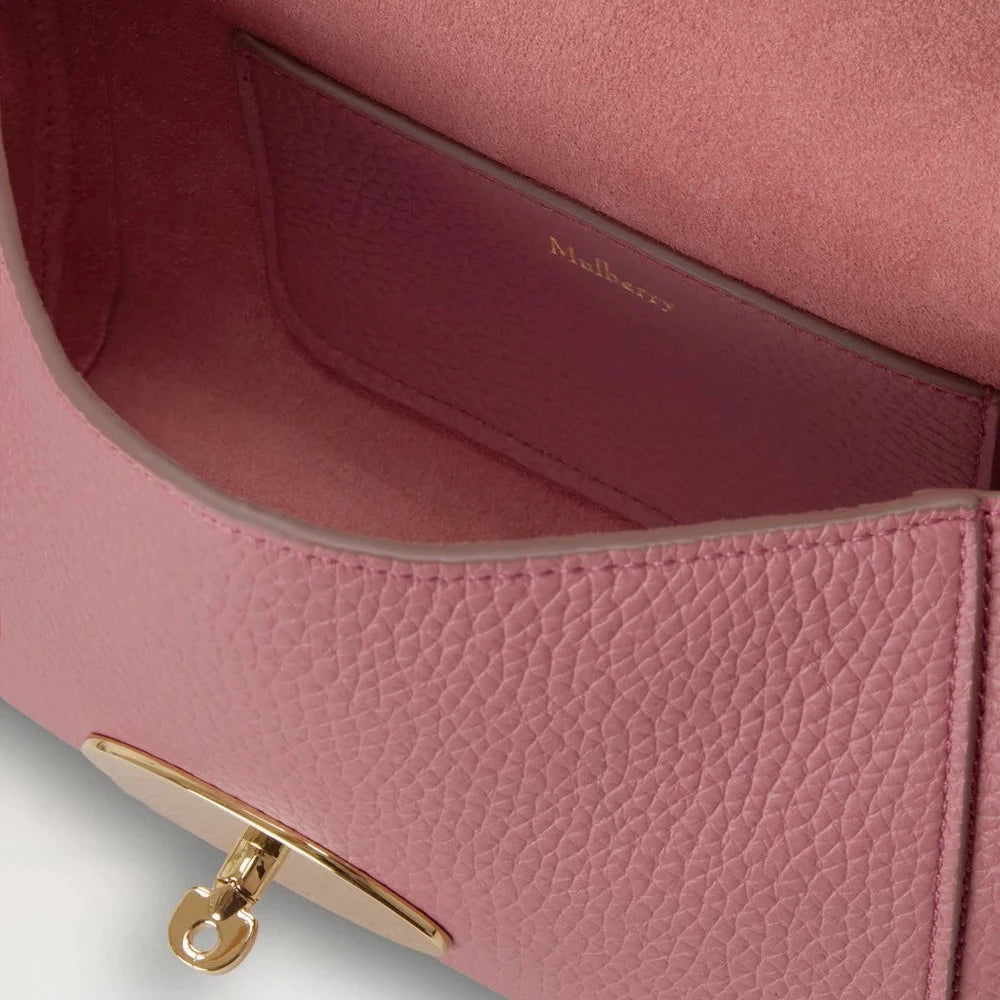 Tasken er udført i Pink Scrumpy Heavy Grain-læder, en blød og smidig bovin læderkvalitet med en flot, let struktureret overflade. Læderet bliver gradvist endnu blødere med brug, hvilket fremhæver dets naturlige skønhed og giver tasken mere karakter over tid. De gyldne detaljer, Mulberrys ikoniske Postman’s Lock og den hængende læderfob med skjult hængelås tilfører et eksklusivt og genkendeligt udtryk.