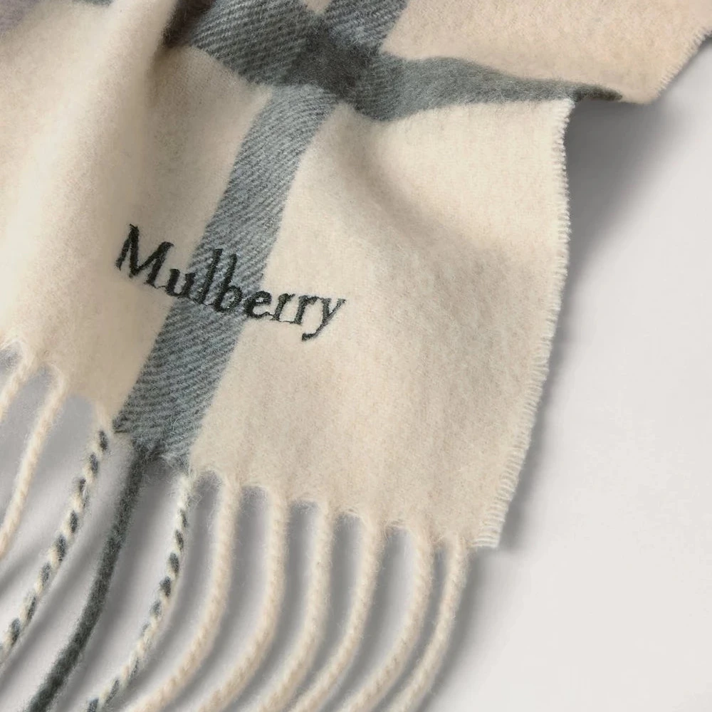 - Detaljer: Ternet mønster, broderet Mulberry-logo og frynser i enderne