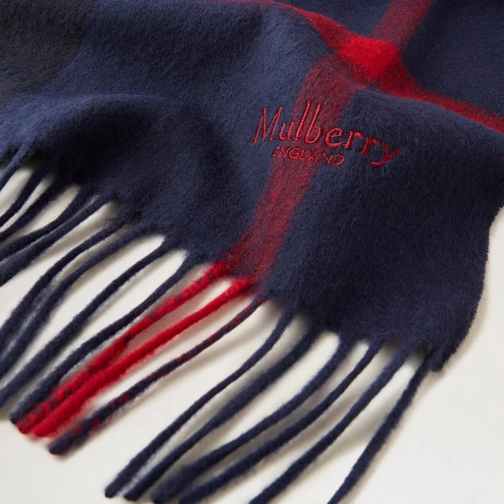 Mulberry Small Check Merino Wool Scarf – Night Sky & Lancaster Red / Uldtørklæde i Mørkeblå og Rød: