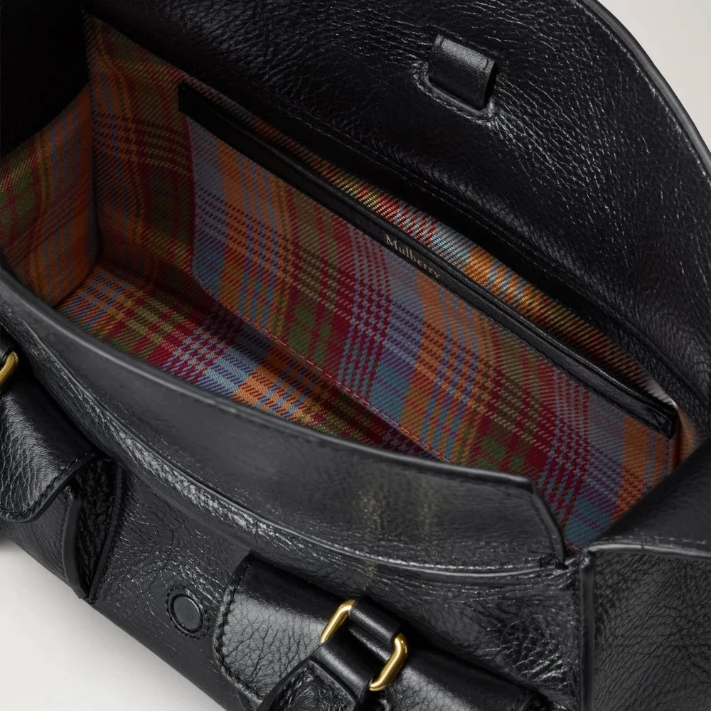 Tasken er fremstillet i smukt High Shine-læder med naturlig kornstruktur og en luksuriøs, blank overflade. Den har to frontlommer med magnetlukning, et praktisk hovedrum og en aftagelig, justerbar skulderrem, som giver mulighed for at bære den både på skulderen, crossbody eller i hånden med de dobbelte hanke. Den indvendige Heritage Check-foring og den diskrete Mulberry-signatur sætter prikken over i’et på denne elegante mini-klassiker.