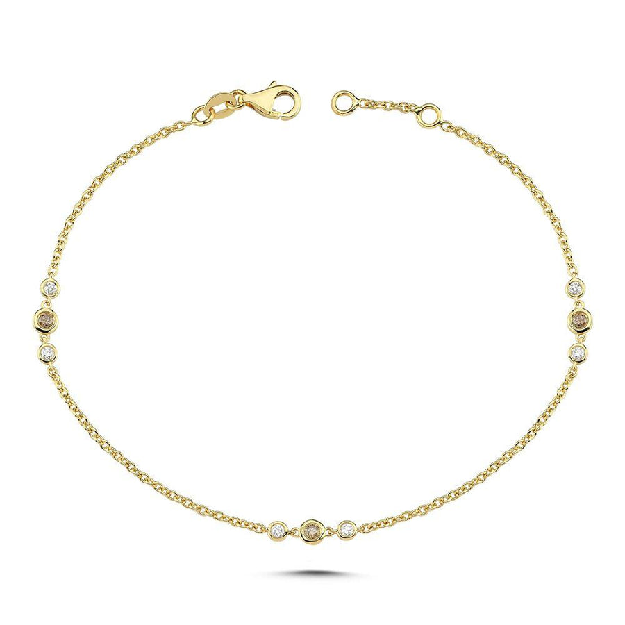 Nuran Champagne armbåndet i 14 kt. guld er en ægte juvel med tre strålende champagnefarvede diamanter, hver på 0,03 carat, samt seks glitrende 0,02 carat W-si brillanter.
