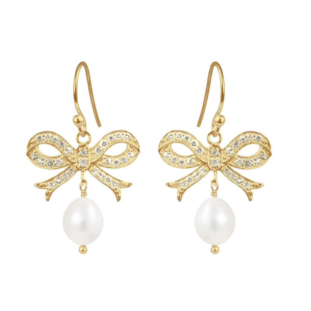 Disse elegante øreringe fra Susanne Friis Bjørner kombinerer klassisk charme med et luksuriøst strejf. Øreringene er fremstillet i 925 sterlingsølv belagt med forgyldning og dekoreret med en detaljeret sløjfe, omkranset af funklende zirkonia. Fra sløjfen hænger en smuk, hvid ferskvandsperle, der fuldender det sofistikerede design. Perfekte til både hverdag og særlige lejligheder.